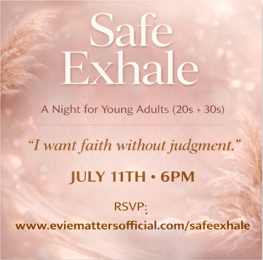 Safe Exhale is a curated gathering designed for young adults who are spiritually exhausted, church-wounded, or quietly searching for the Father again — without pressure, performance, or religious heaviness.